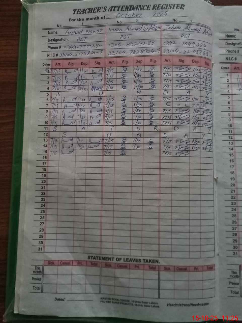 | CNIC | Full Name | Designation | R/C | Absence During Last Calender Month |