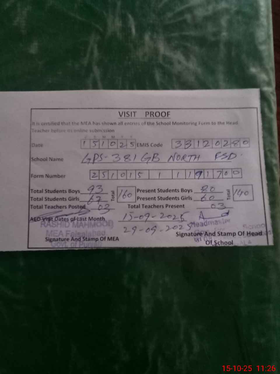 | Attendance Register | Head Teacher | MEA with School | Visit Proof |