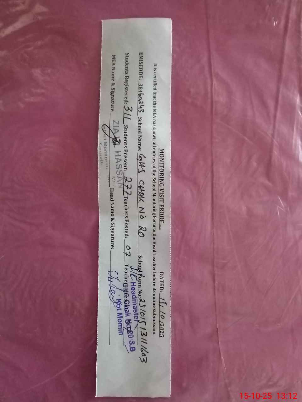 | Certified that this School was Inspected by the Undersigned MEA/DMO Today and the Information Stated Above is as Per Record. | |||||