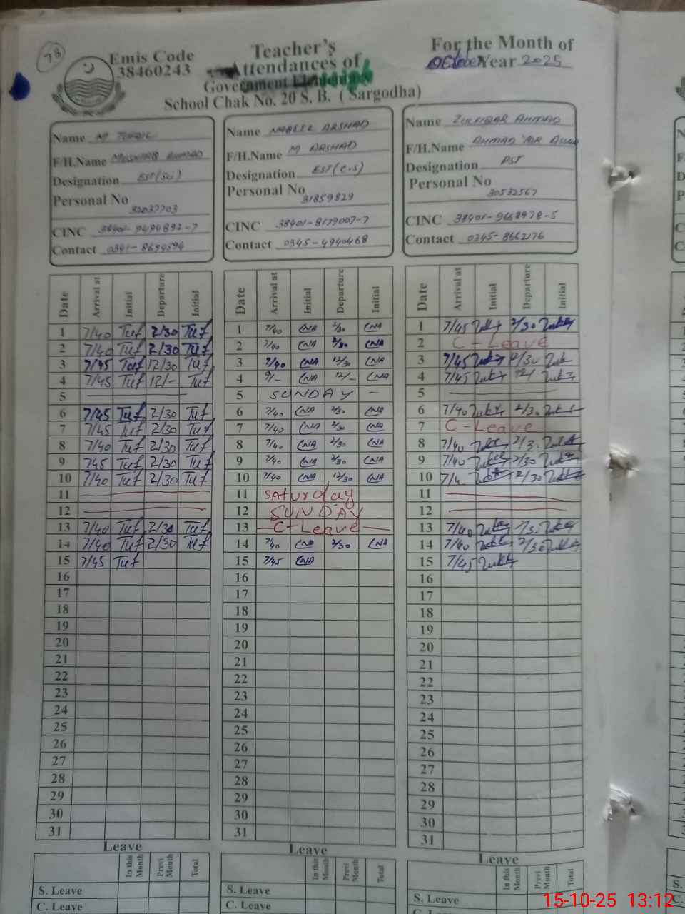 | CNIC | Full Name | Designation | R/C | Absence during last cal. month |