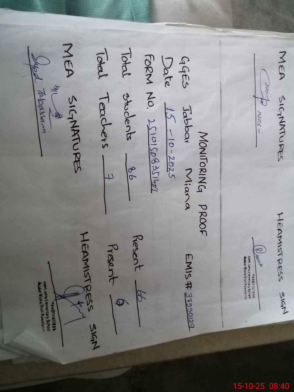 | Certified that this School was Inspected by the Undersigned MEA/DMO Today and the Information Stated Above is as Per Record. | |||||