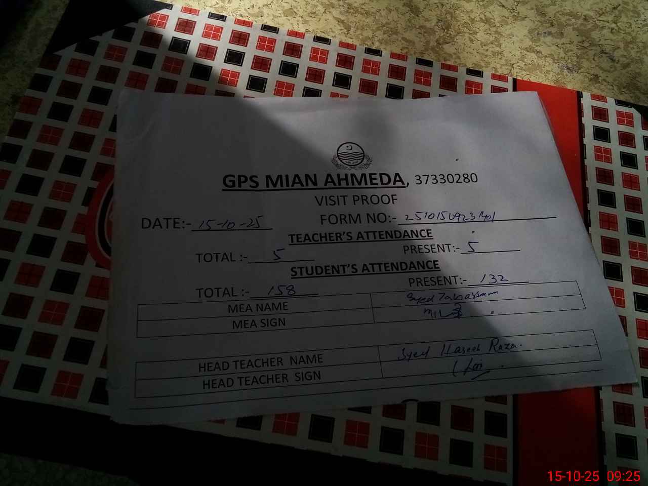 | Attendance Register | Head Teacher | MEA with School | Visit Proof |
