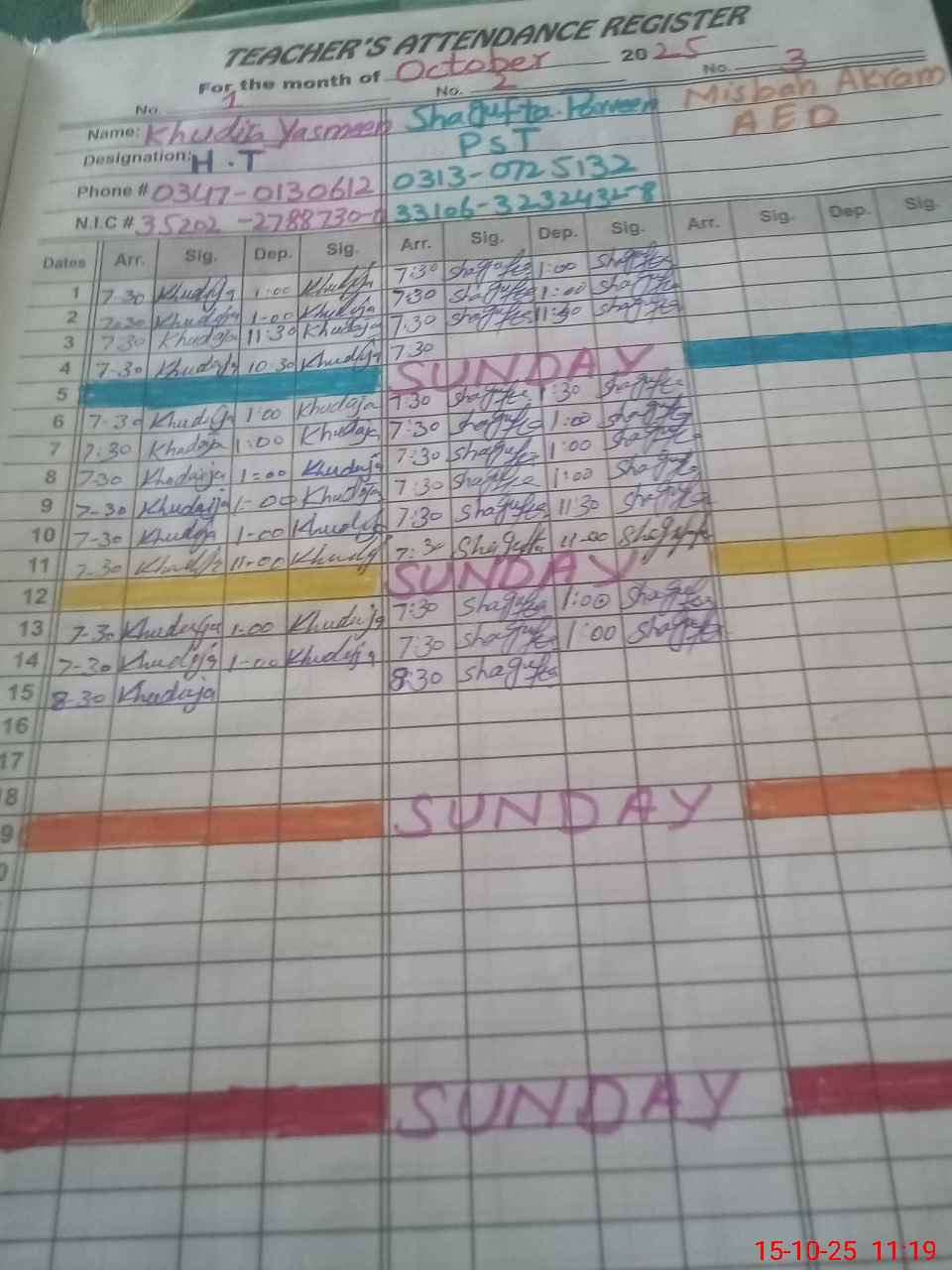 | CNIC | Full Name | Designation | R/C | Absence during last cal. month |