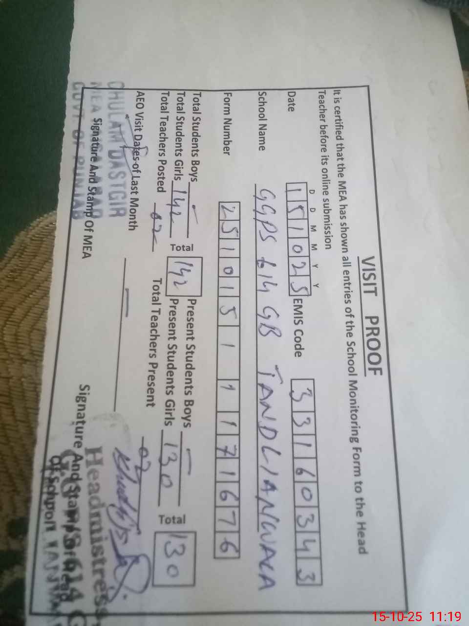 | Attendance Register | Head Teacher | MEA with School | Visit Proof |