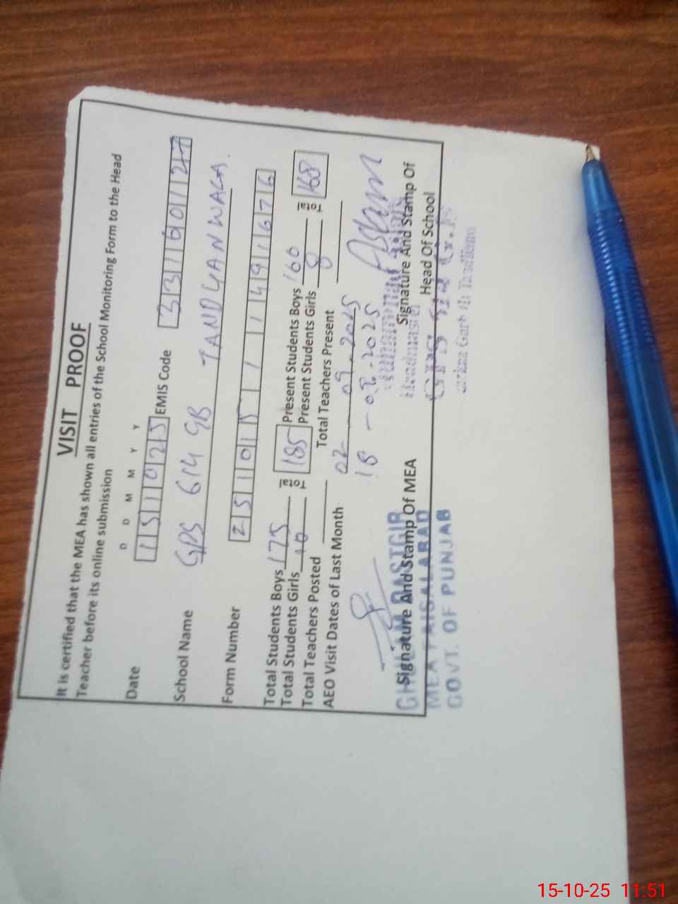 | Certified that this School was Inspected by the Undersigned MEA/DMO Today and the Information Stated Above is as Per Record. | |||||