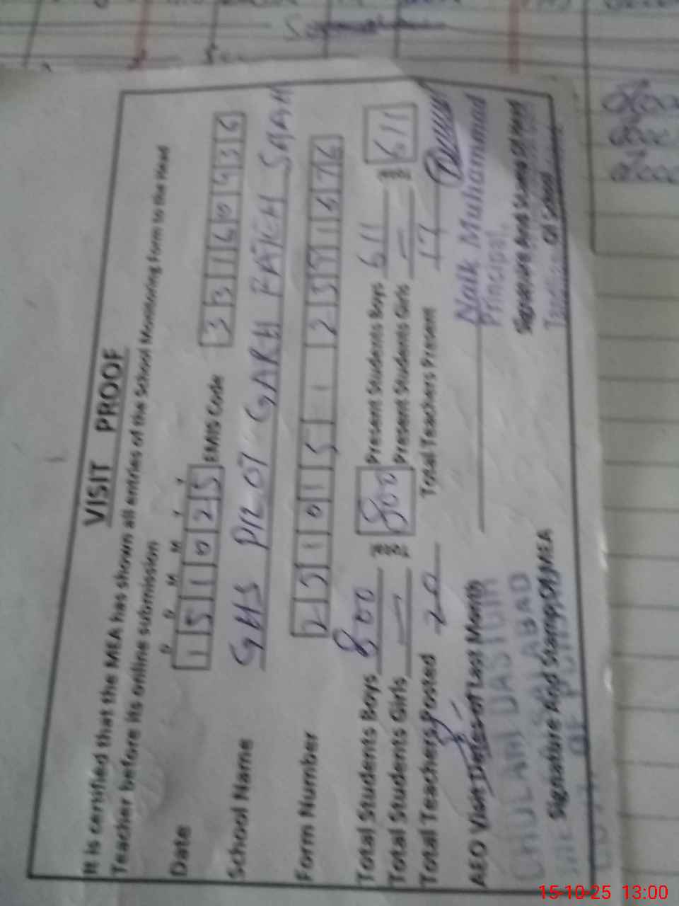 | Attendance Register | Head Teacher | MEA with School | Visit Proof |
