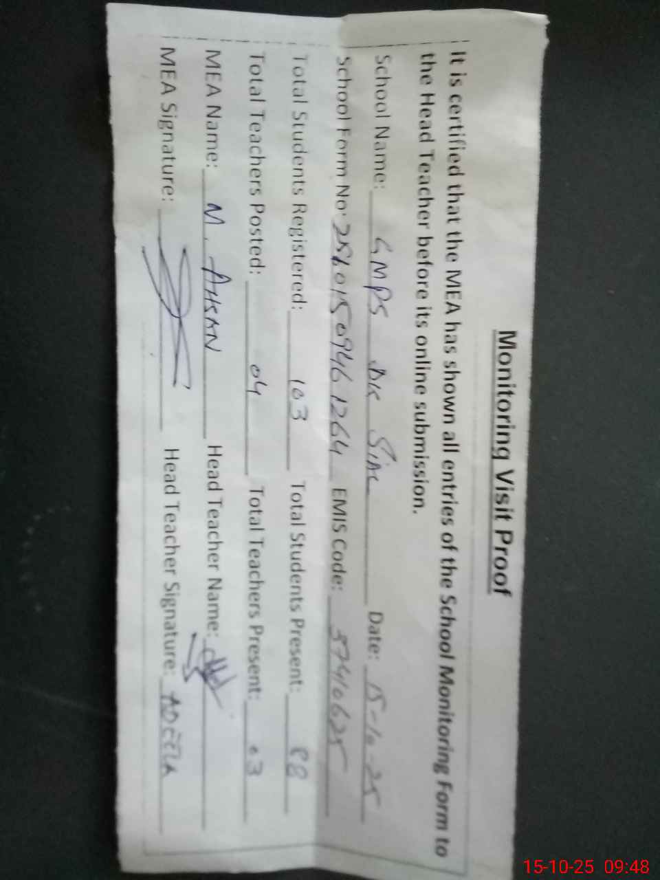 | Certified that this School was Inspected by the Undersigned MEA/DMO Today and the Information Stated Above is as Per Record. | |||||