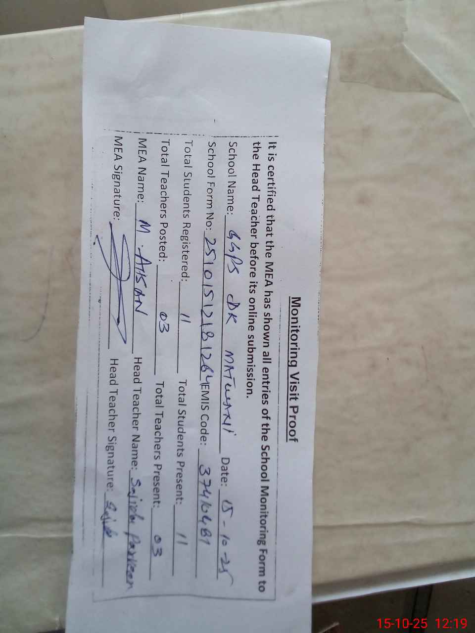 | Attendance Register | Head Teacher | MEA with School | Visit Proof |