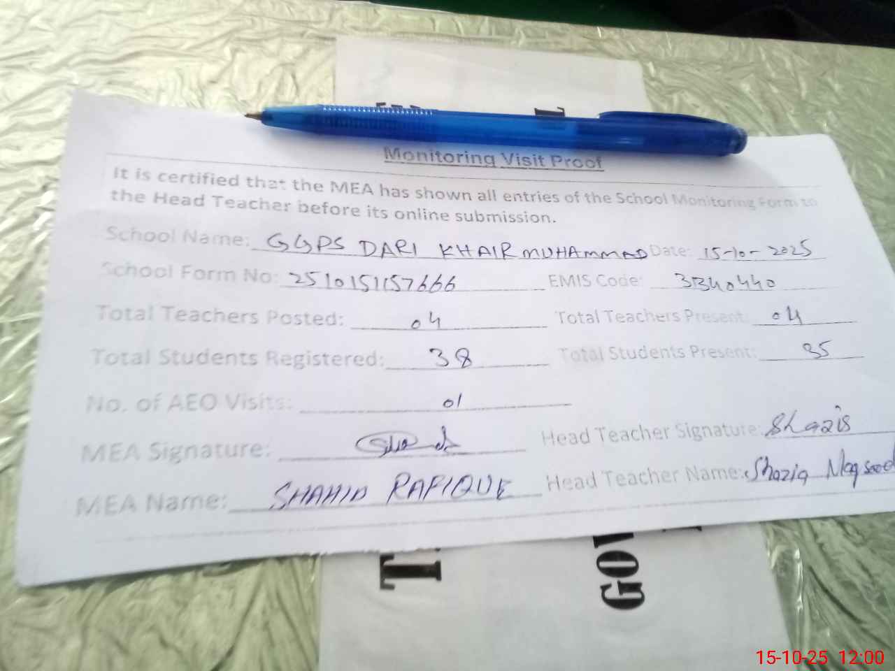| Attendance Register | Head Teacher | MEA with School | Visit Proof |