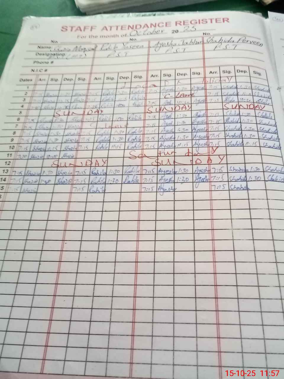 | CNIC | Full Name | Designation | R/C | Absence During Last Calender Month |