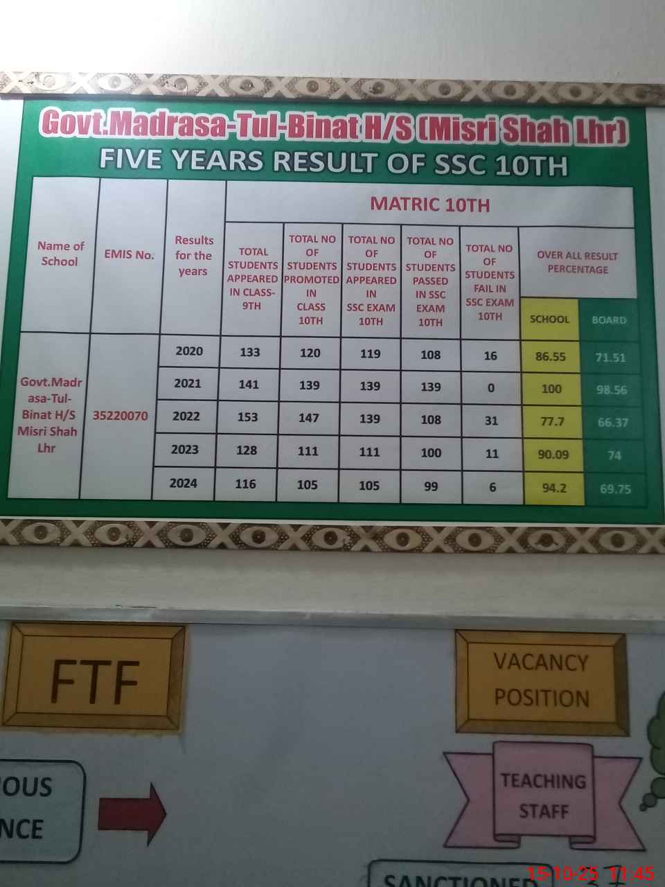 | EMIS Code: 35220070 | Name of School: GGHS MADRASA-TUL-BINAT MISRI SHAH AZIZ ROAD | |||