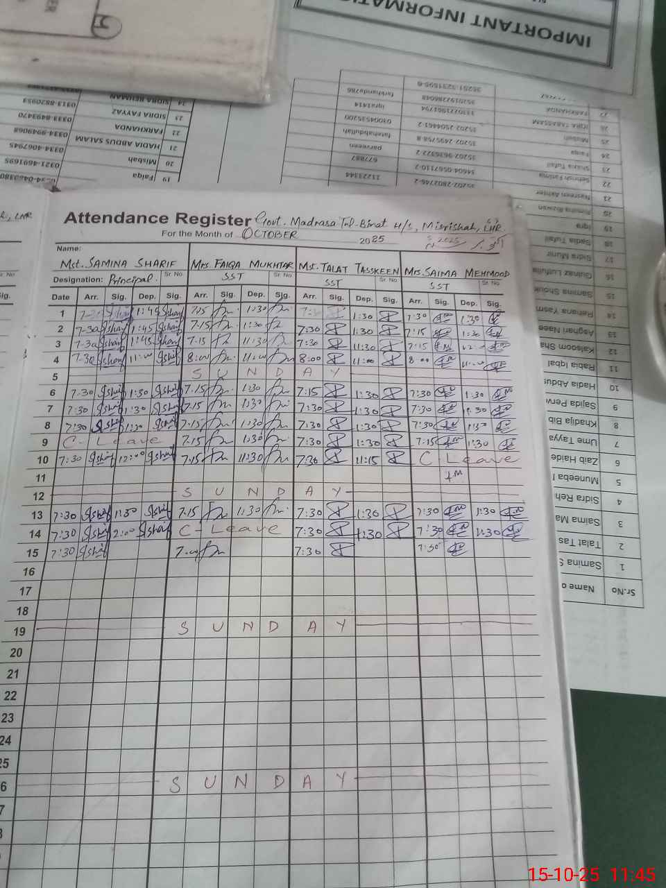 | CNIC | Full Name | Designation | R/C | Absence During Last Calender Month |