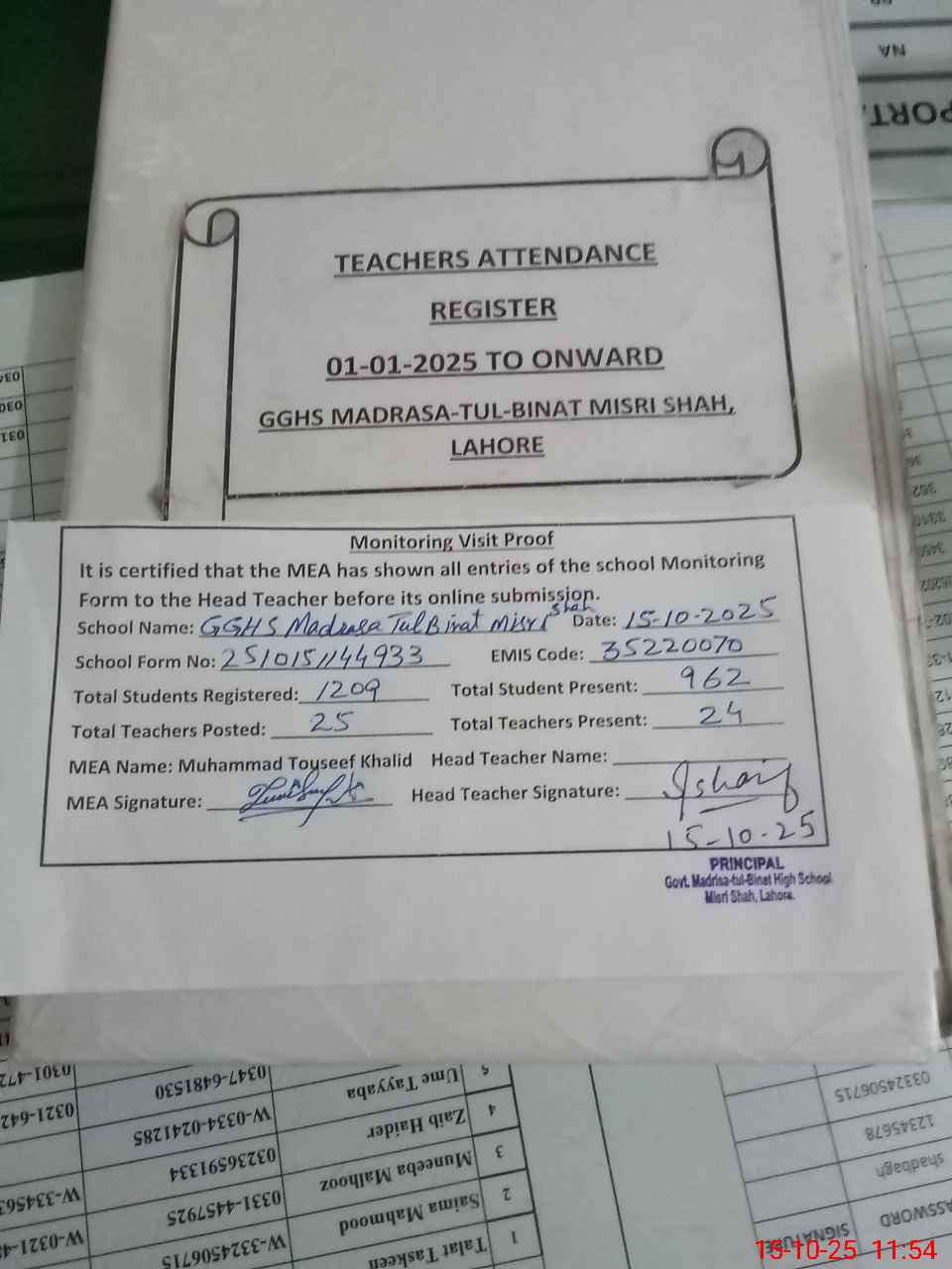 | Monitoring Date: 15-10-2025 | Start Time: 15-10-2025 10:52 AM | End Time: 15-10-2025 11:54 AM | Name of MEA: M.**** KH**** | |