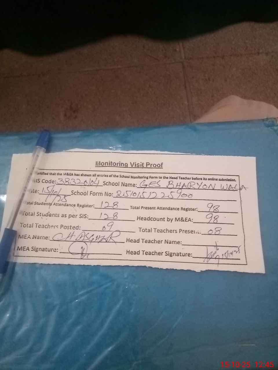 | Attendance Register | Head Teacher | MEA with School | Visit Proof |