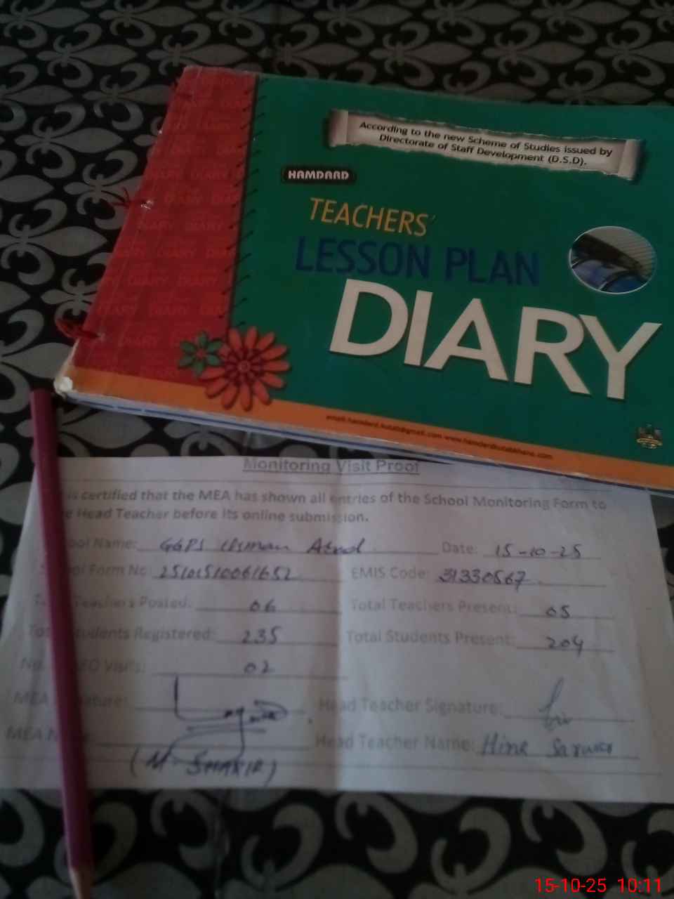 | Attendance Register | Head Teacher | MEA with School | Visit Proof |