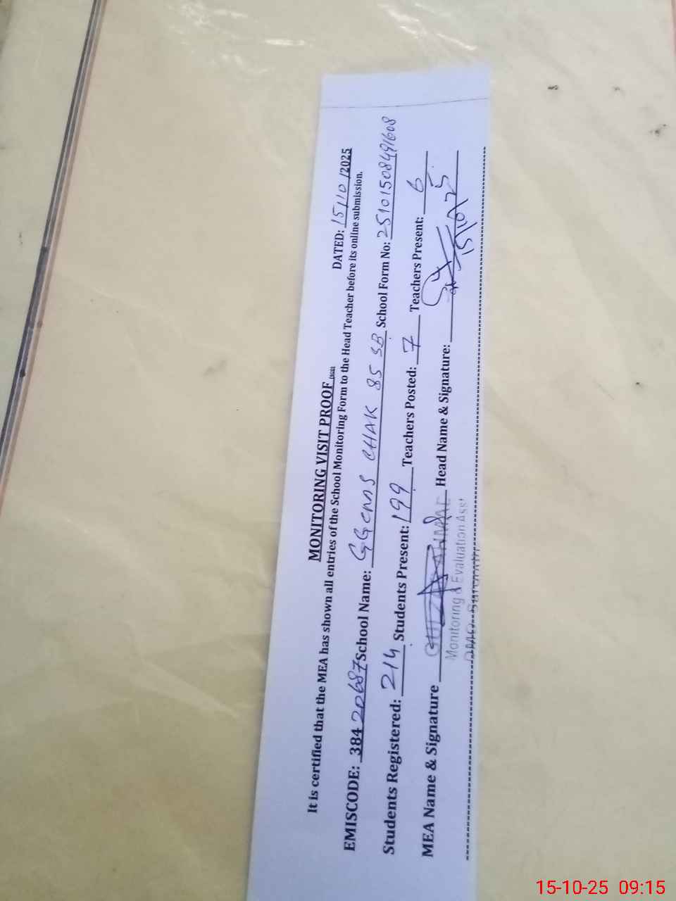 | Attendance Register | Head Teacher | MEA with School | Visit Proof |