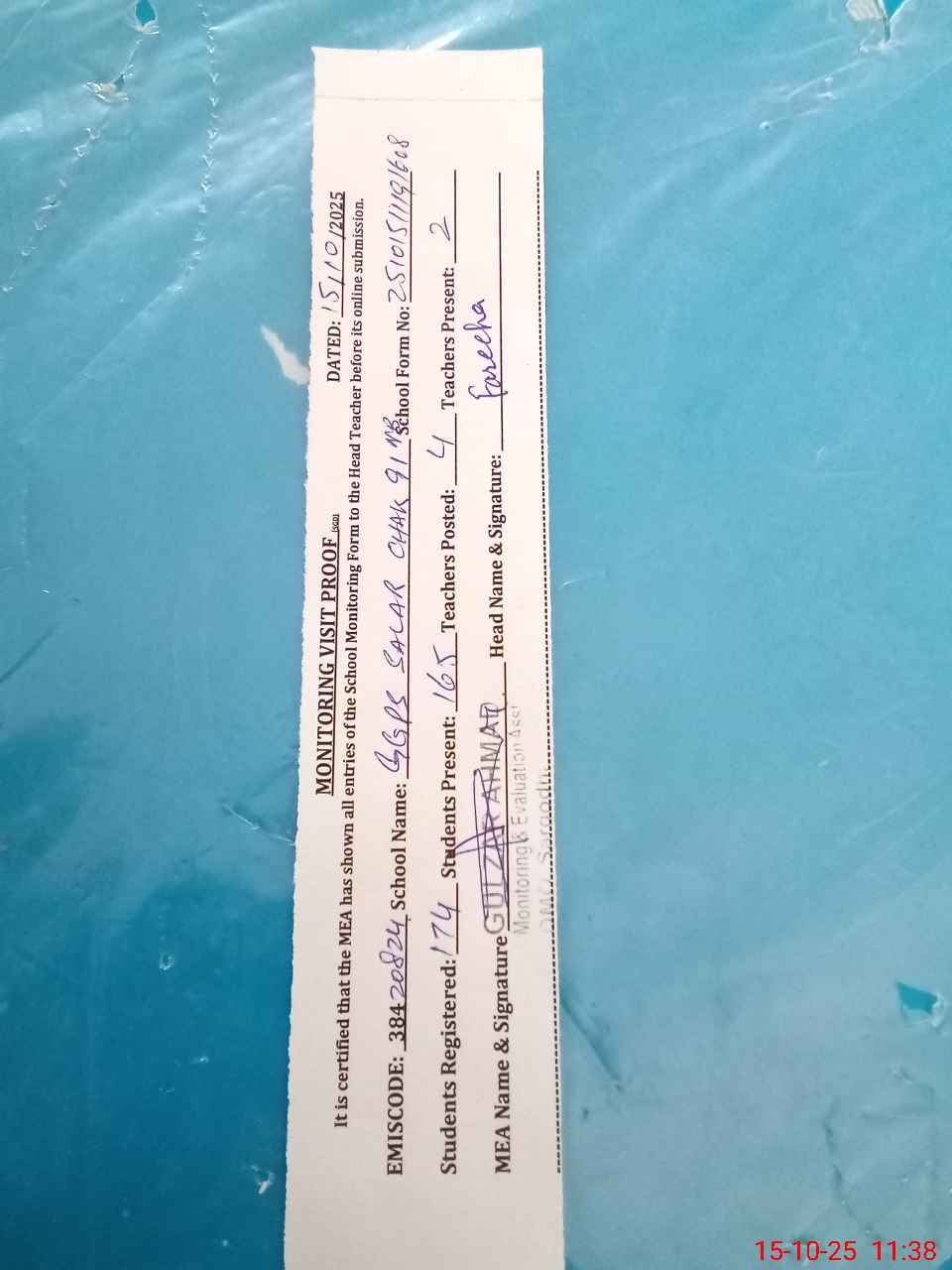 | EMIS Code: 38420824 | Name of School: GGPS SALAR JINAH ABADI CHAK NO. 91-NB | |||