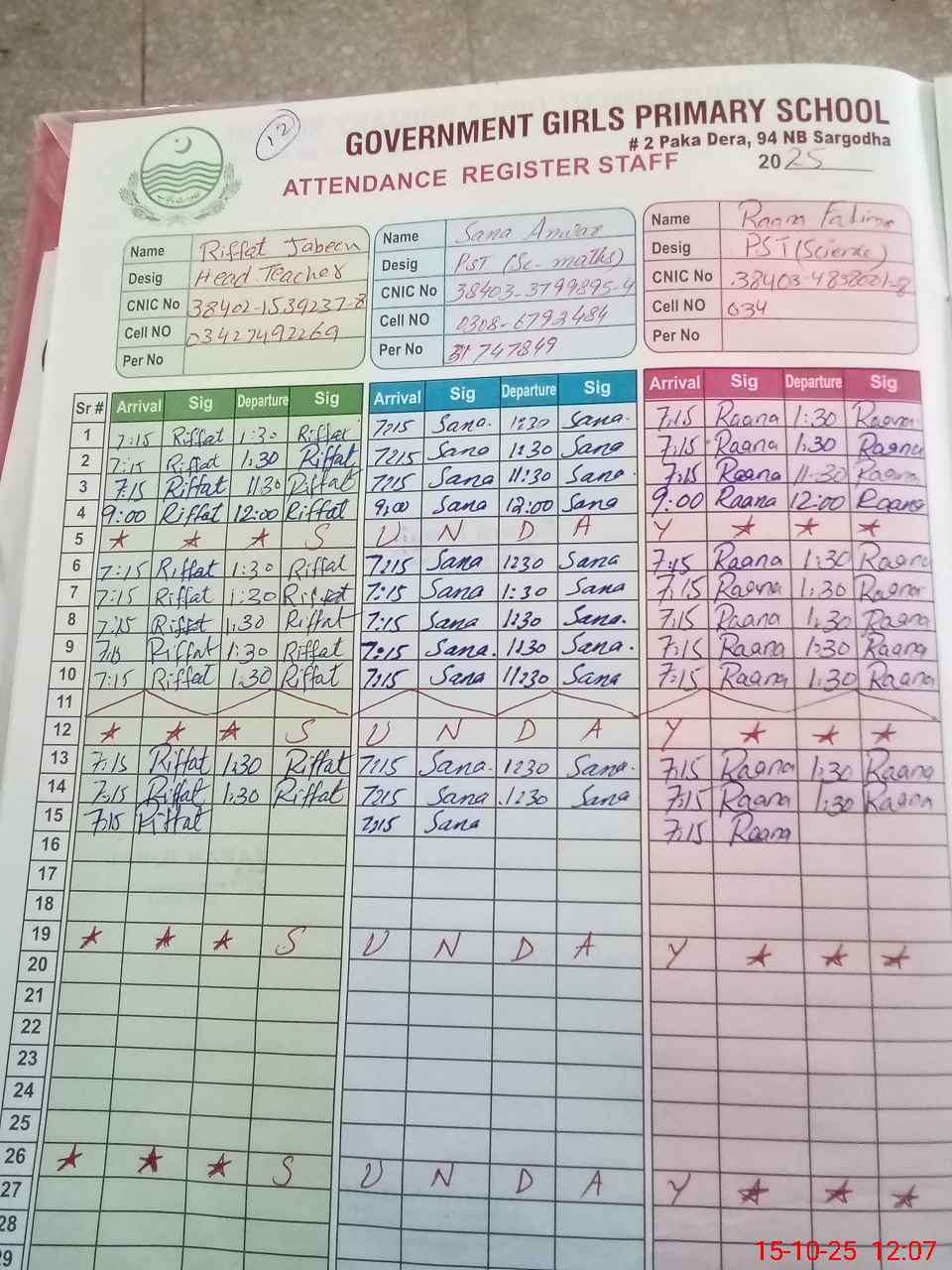 | CNIC | Full Name | Designation | R/C | Absence During Last Calender Month |