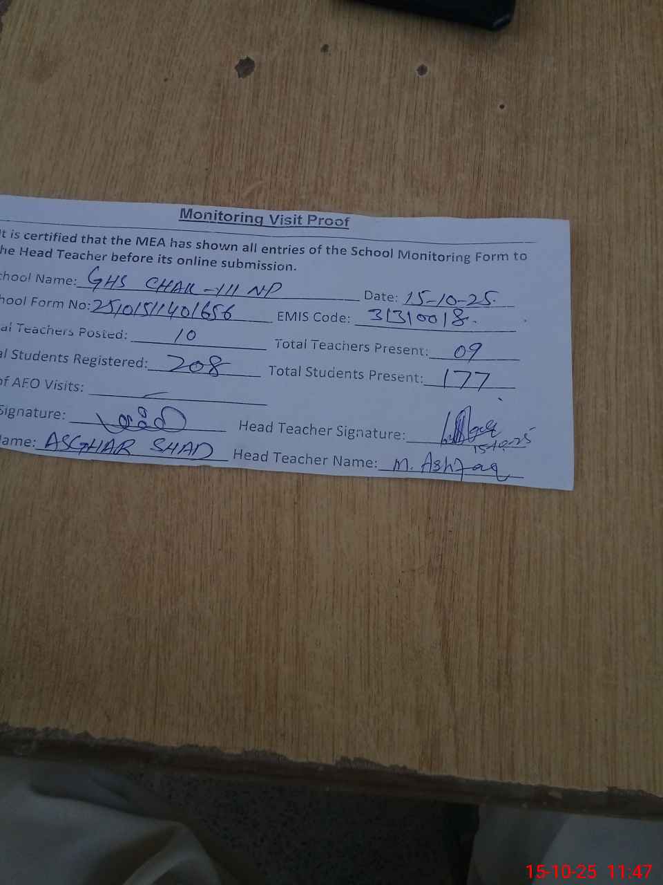 | Attendance Register | Head Teacher | MEA with School | Visit Proof |