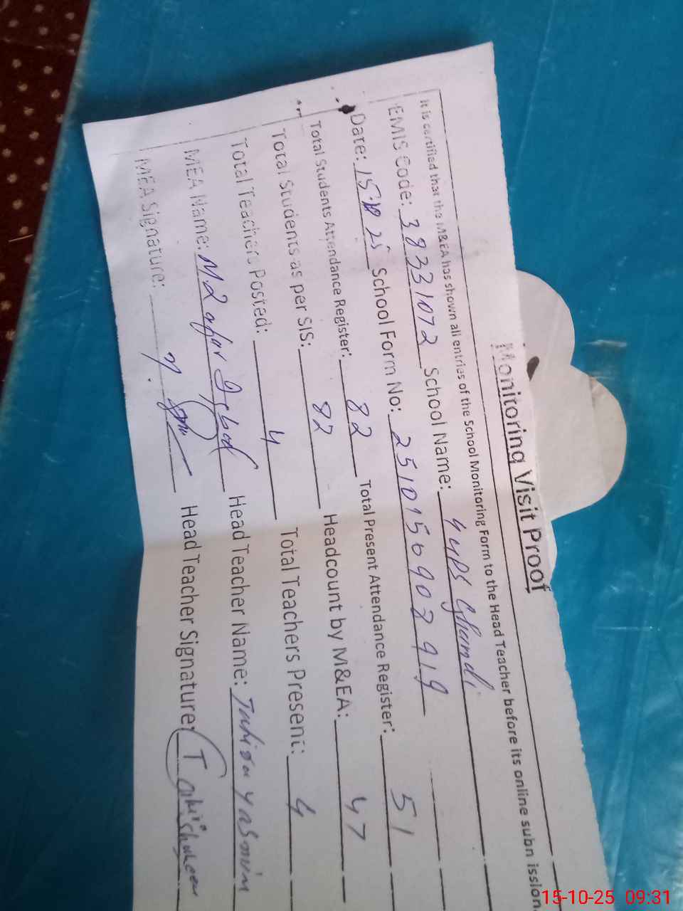 | Attendance Register | Head Teacher | MEA with School | Visit Proof |