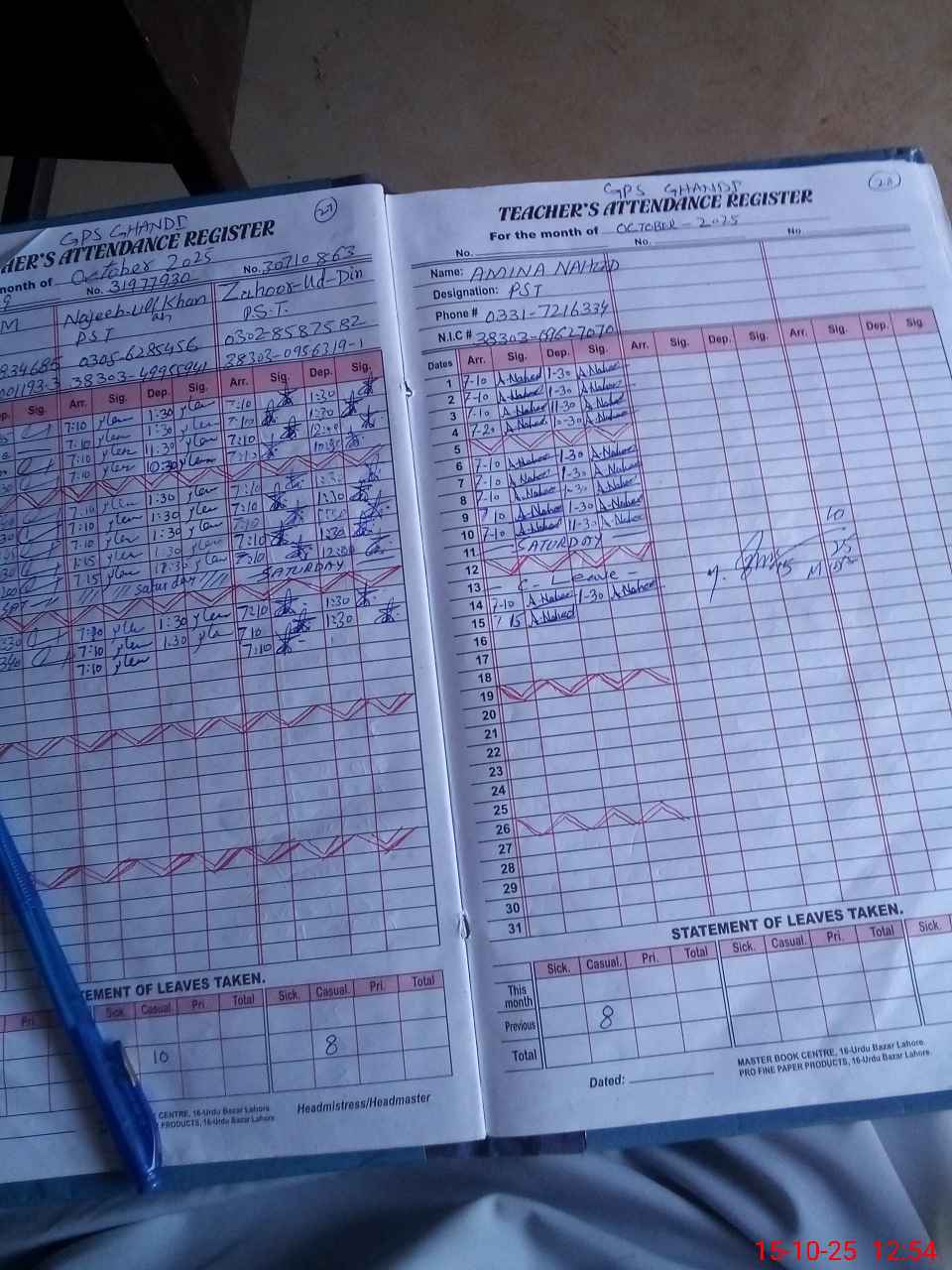 | CNIC | Full Name | Designation | R/C | Absence During Last Calender Month |