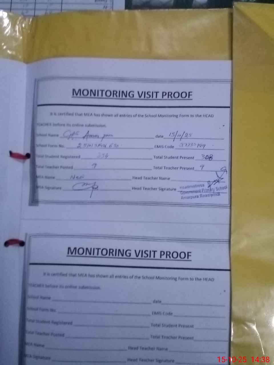 | Attendance Register | Head Teacher | MEA with School | Visit Proof |