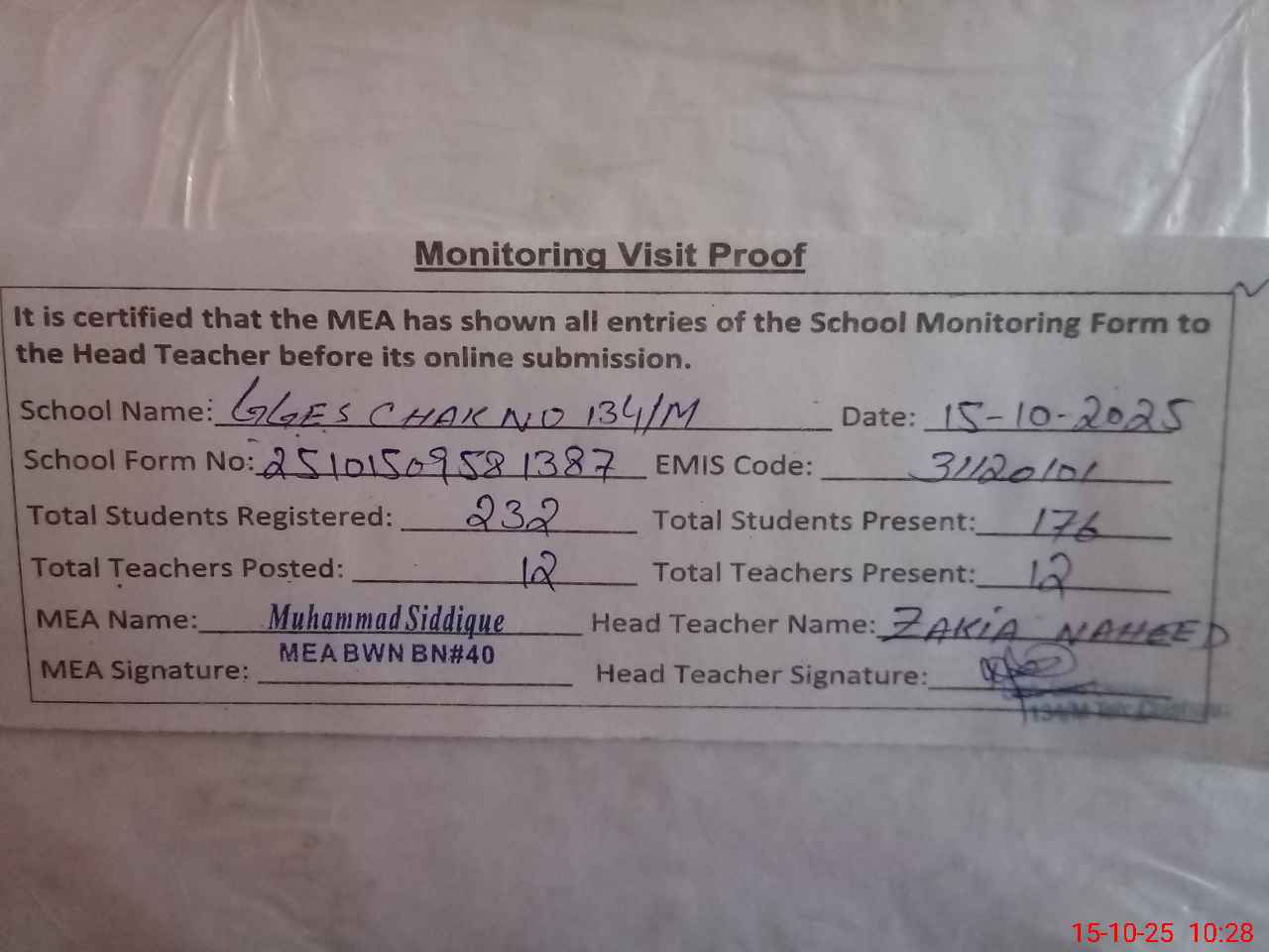 | EMIS Code: 31120101 | Name of School: GGES CHAK NO 134 MURAD | |||