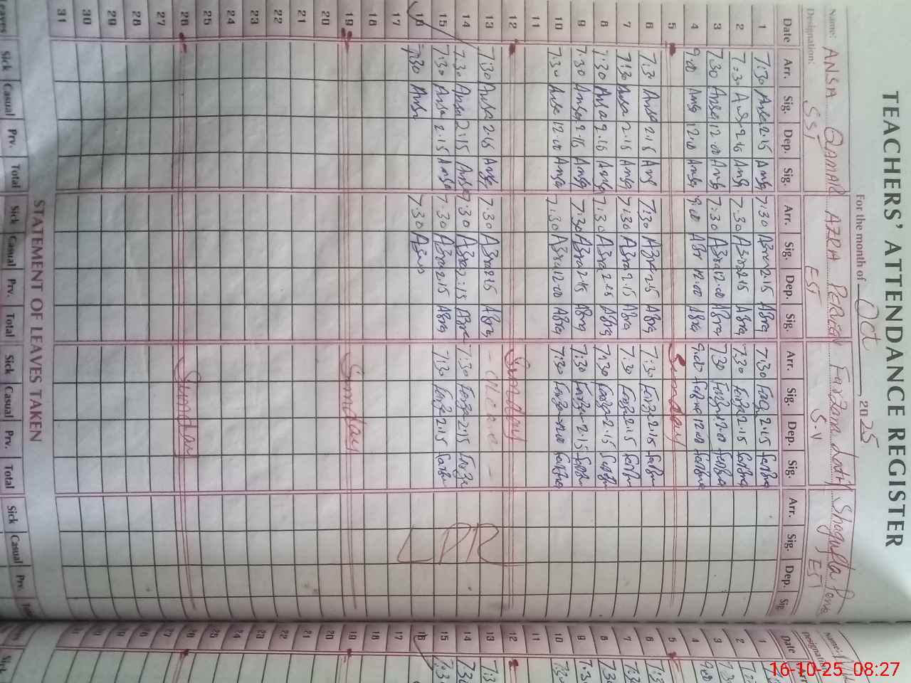 | 34**** | Fa**** La**** | 1 | 2 | 0 | 0 | 0 | 0 | 0 | 0 | 0 | 2 | Absent (Un-Authorized) | |