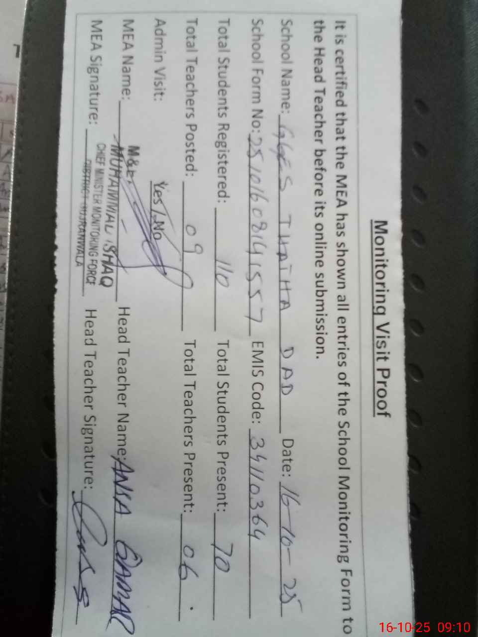 | Attendance Register | Head Teacher | MEA with School | Visit Proof |