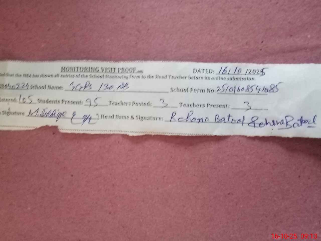 | Attendance Register | Head Teacher | MEA with School | Visit Proof |