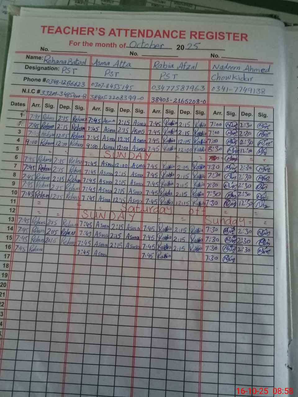 | CNIC | Full Name | Designation | R/C | Absence during last cal. month |