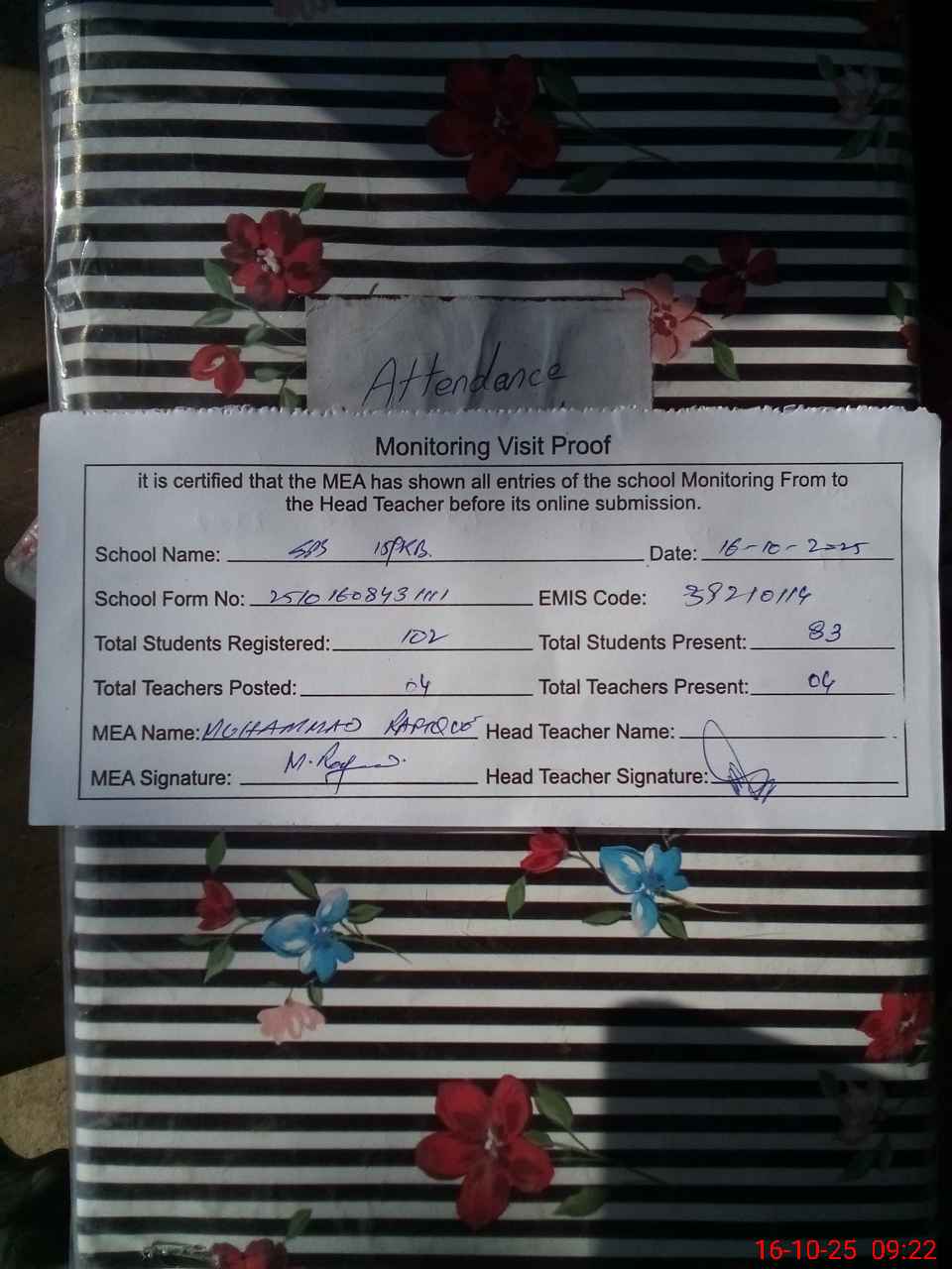 | Attendance Register | Head Teacher | MEA with School | Visit Proof |