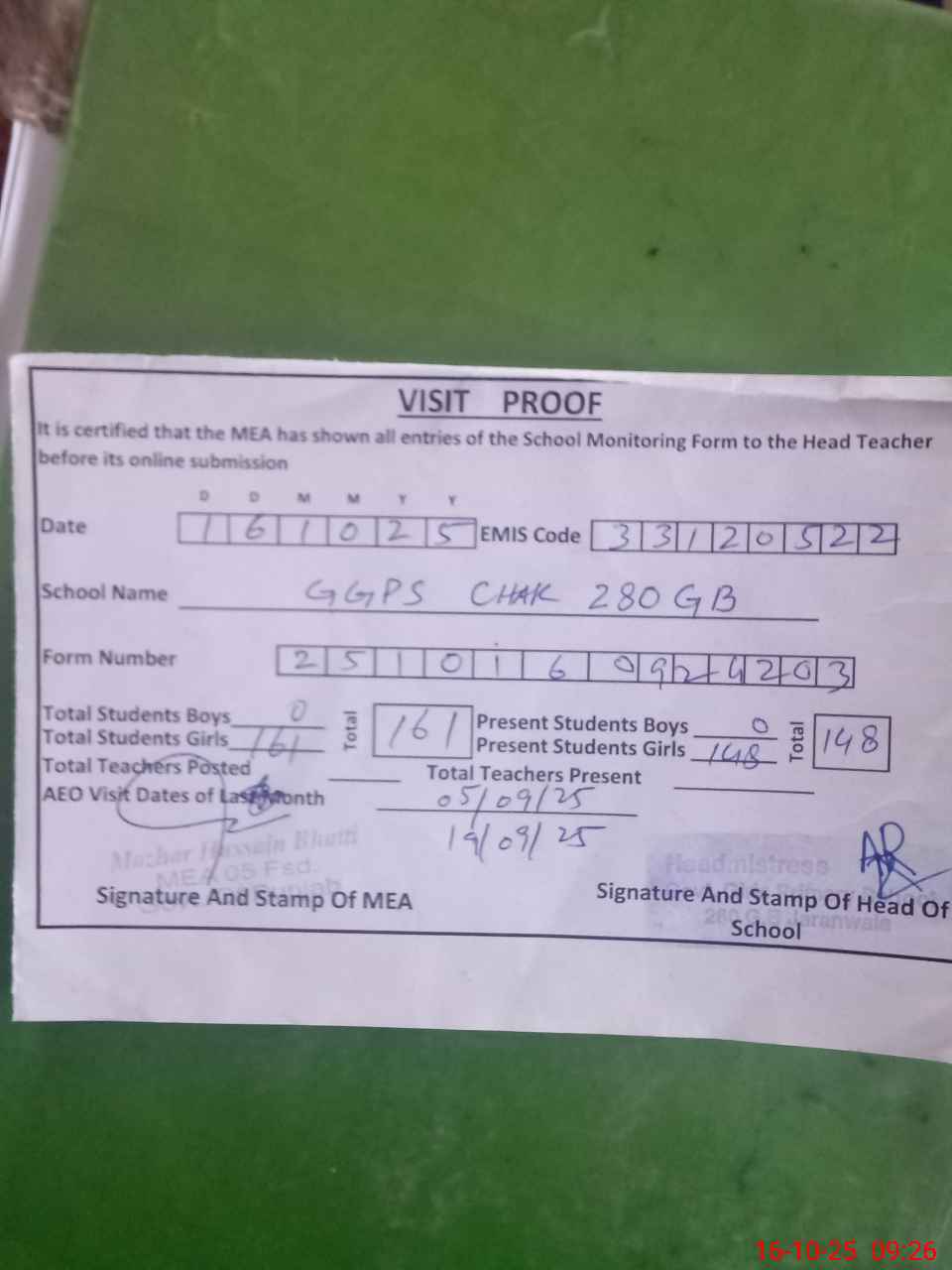 | EMIS Code: 33120522 | Name of School: GGPS CHAK 280 GB I SATNA | |||