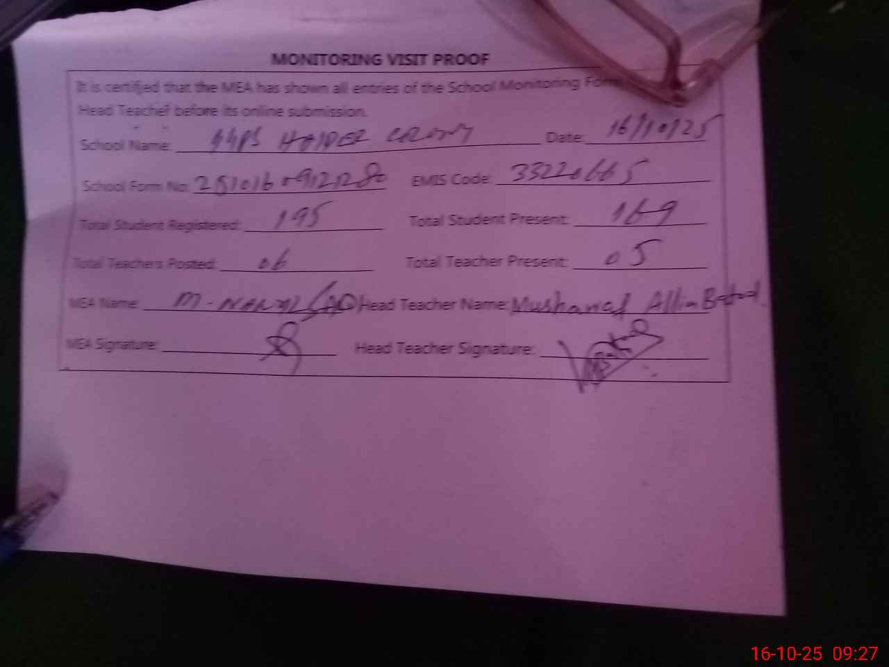 | Attendance Register | Head Teacher | MEA with School | Visit Proof |
