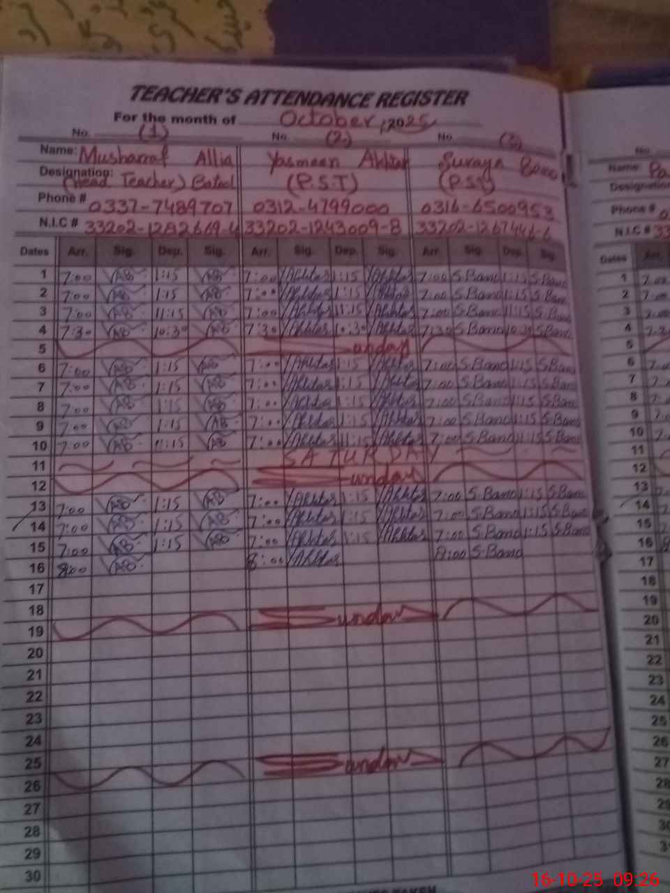 | CNIC | Full Name | Designation | R/C | Absence during last cal. month |