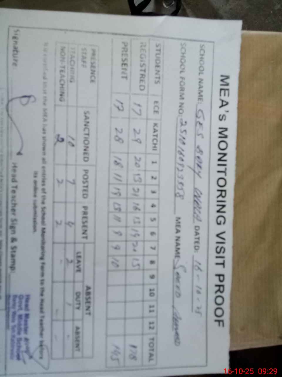 | Attendance Register | Head Teacher | MEA with School | Visit Proof |