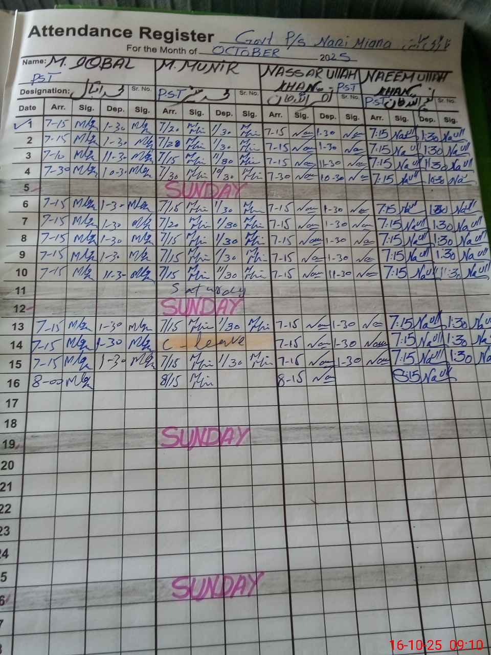 | CNIC | Full Name | Designation | R/C | Absence During Last Calender Month |