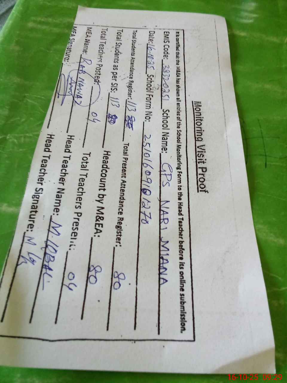 | Attendance Register | Head Teacher | MEA with School | Visit Proof |