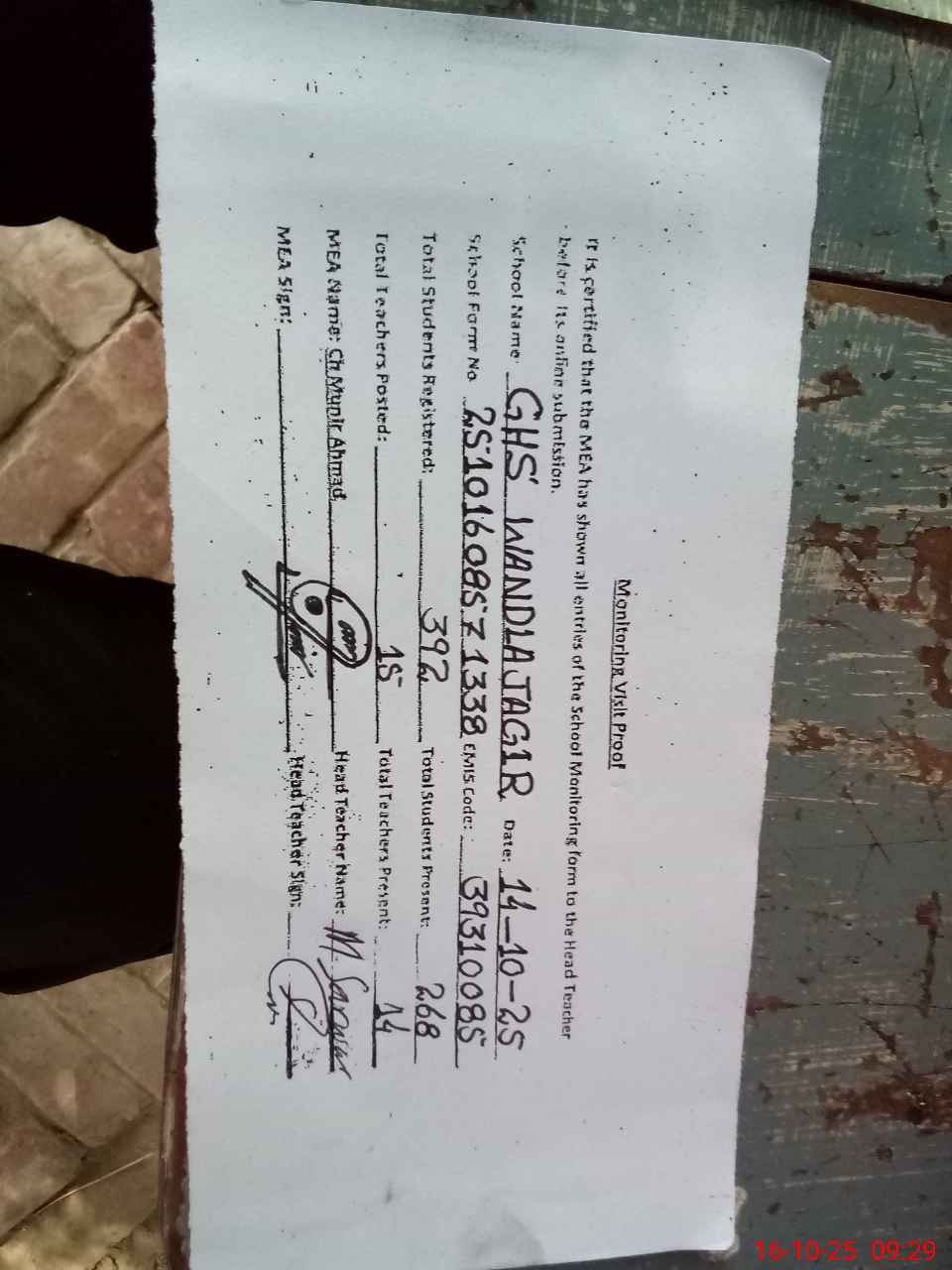 | Certified that this School was Inspected by the Undersigned MEA/DMO Today and the Information Stated Above is as Per Record. | |||||