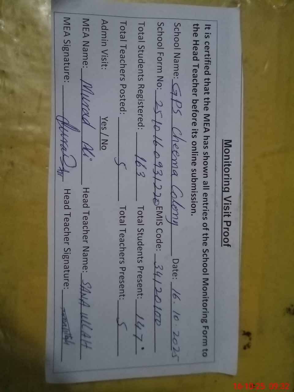 | Attendance Register | Head Teacher | MEA with School | Visit Proof |