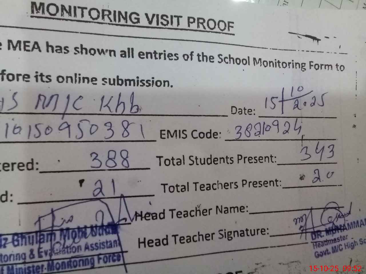 | Certified that this School was Inspected by the Undersigned MEA/DMO Today and the Information Stated Above is as Per Record. | |||||