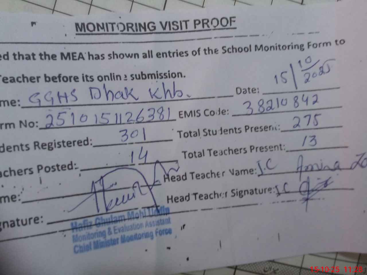 | Certified that this School was Inspected by the Undersigned MEA/DMO Today and the Information Stated Above is as Per Record. | |||||