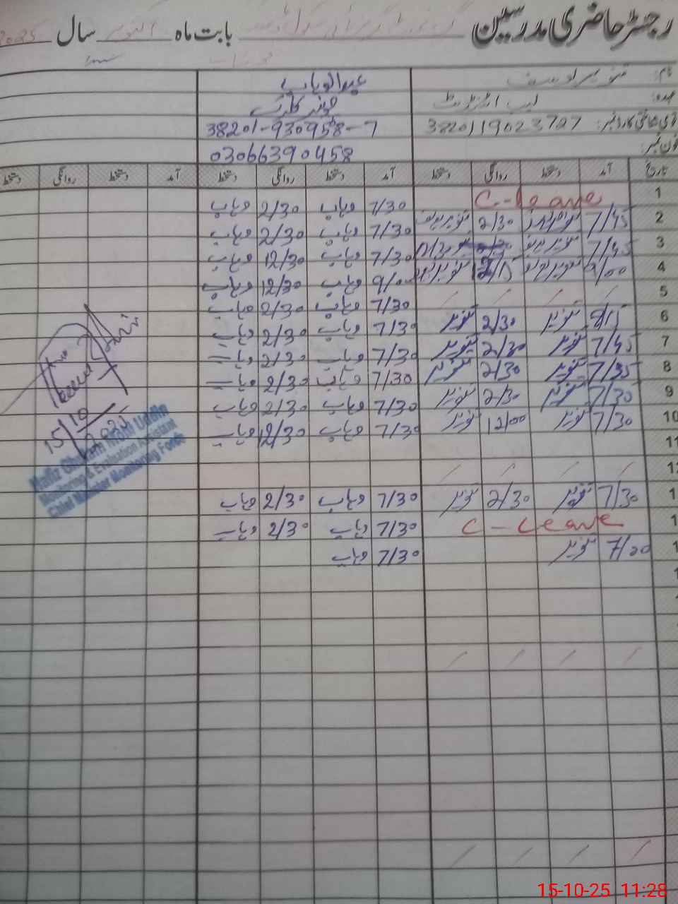 | CNIC | Full Name | Designation | R/C | Absence During Last Calender Month |