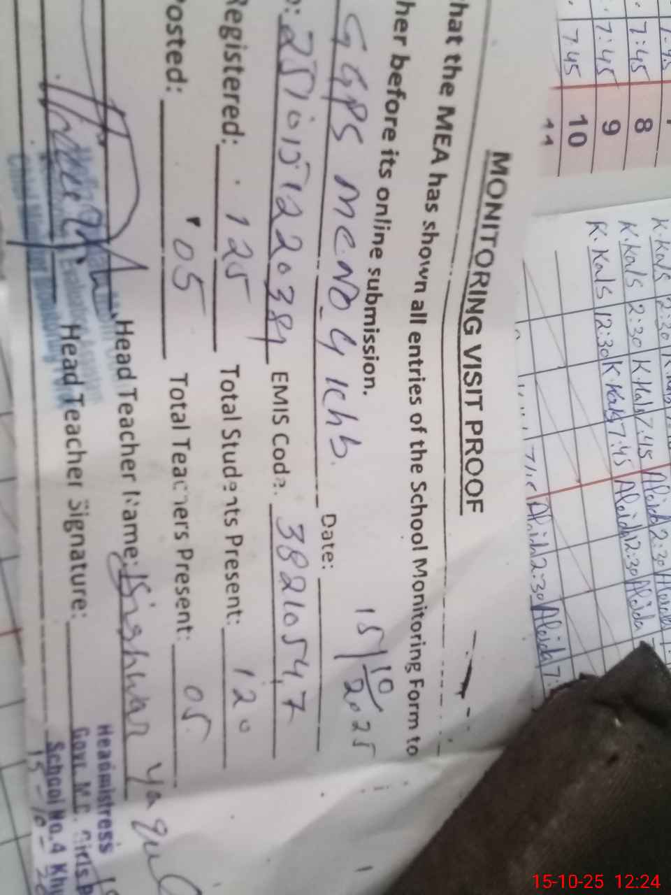 | Attendance Register | Head Teacher | MEA with School | Visit Proof |