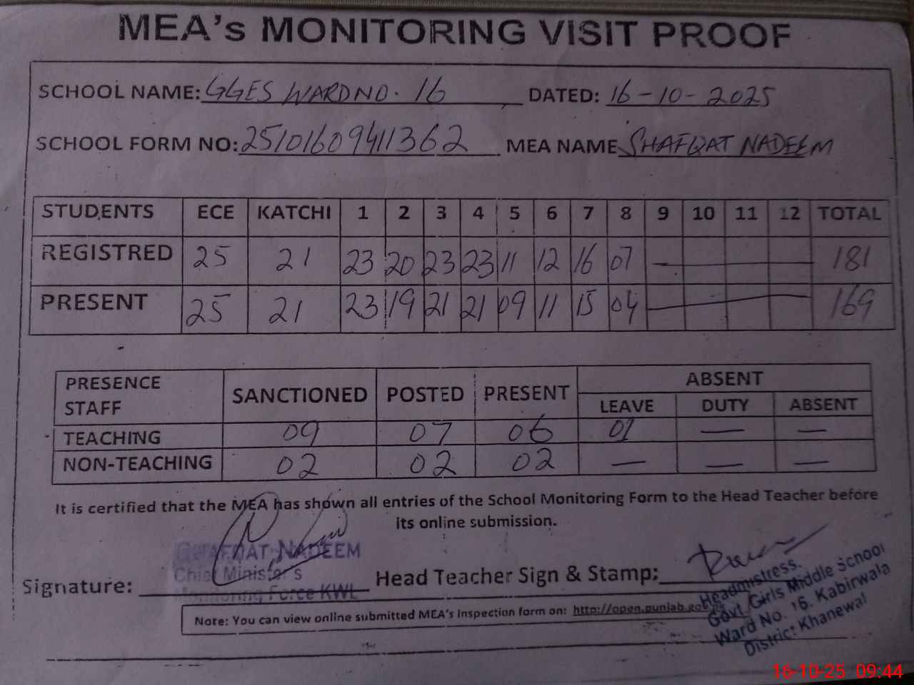 | Attendance Register | Head Teacher | MEA with School | Visit Proof |