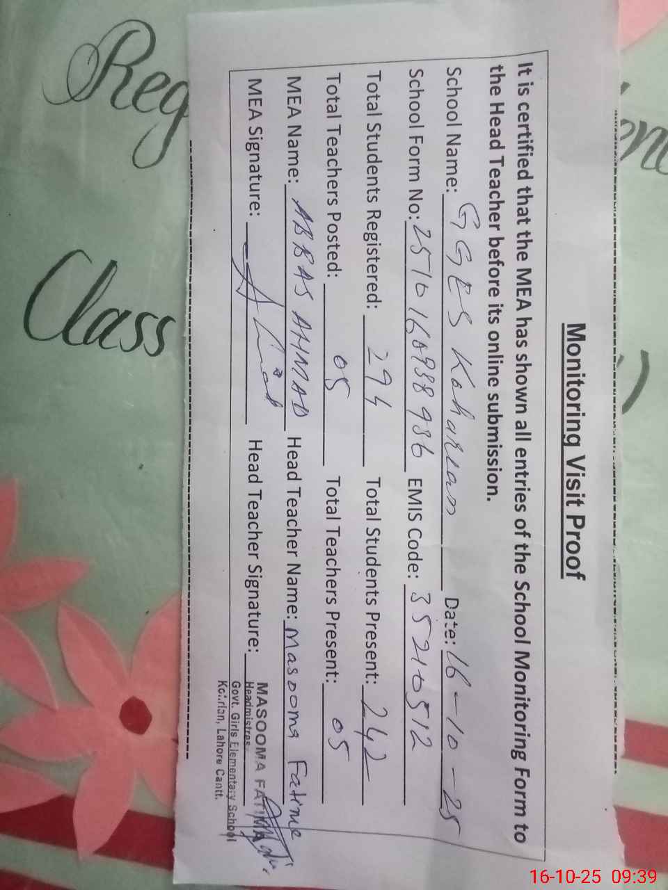| Certified that this School was Inspected by the Undersigned MEA/DMO Today and the Information Stated Above is as Per Record. | |||||