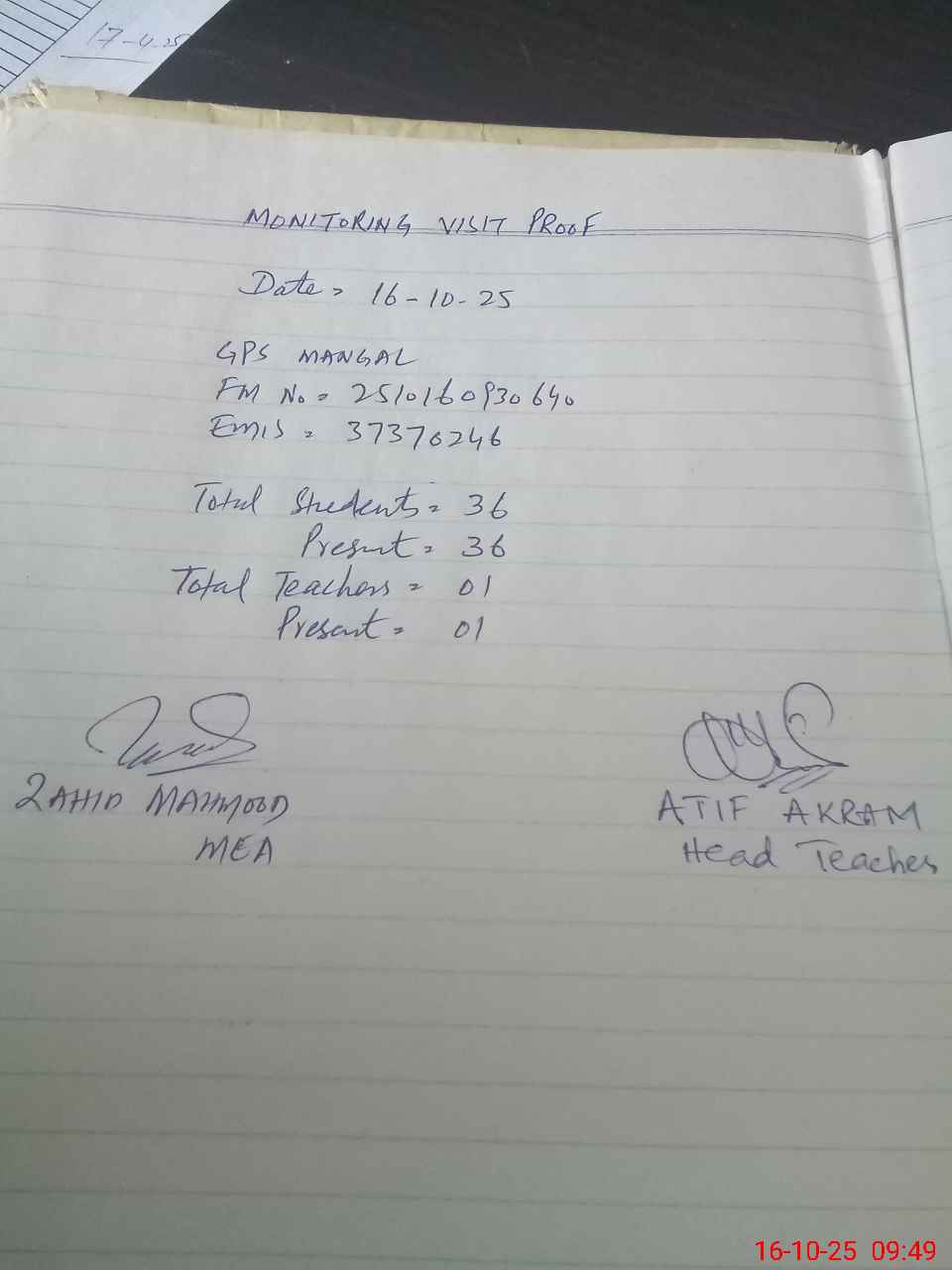 | Attendance Register | Head Teacher | MEA with School | Visit Proof |