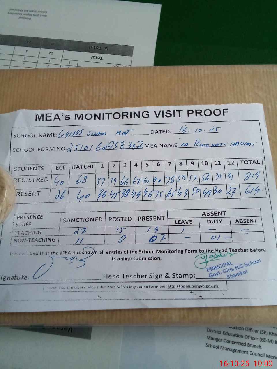 | Certified that this School was Inspected by the Undersigned MEA/DMO Today and the Information Stated Above is as Per Record. | |||||