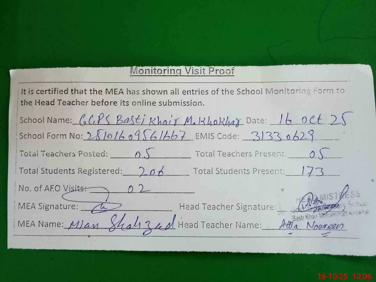 | Certified that this School was Inspected by the Undersigned MEA/DMO Today and the Information Stated Above is as Per Record. | |||||