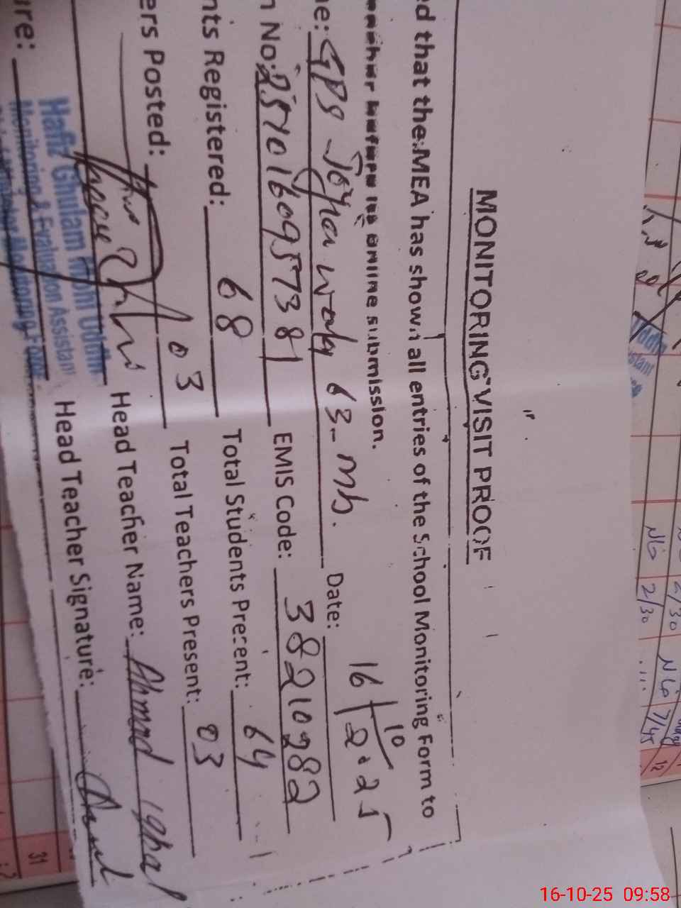 | EMIS Code: 38210282 | Name of School: GPS JOYIA WALA CHAK NO. 63 MB | |||